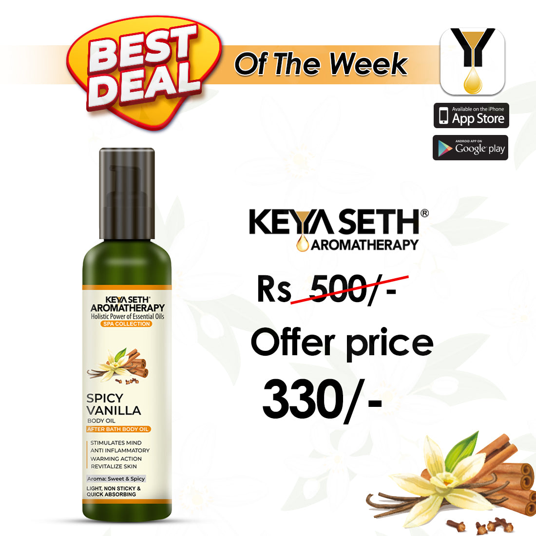 Light, non-sticky Spicy Vanilla After Bath Body Oil that absorbs instantly and deeply nourishes. Powered by Cinnamon, Clove & Vanilla Oils, it provides warmth, soothes dryness, calms the senses, boosts circulation, and refreshes your mind with its cozy spicy-vanilla aroma — perfect for daily post-shower radiance!
