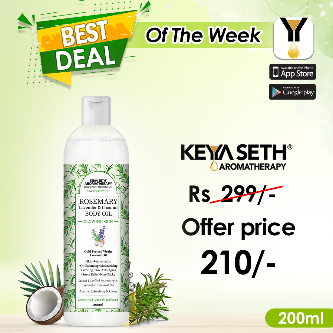 Say Hi to the nourishing skin benefits of Rosemary, Lavender & Coconut oil — A fine blend that imparts a long-lasting hydration & glow to your skin. This non-sticky, pH-balancing & mild body oil is carefully crafted with Virgin Coconut, Rosemary & Lavender Oils to deeply moisturize, reduce dryness & fine lines, calm irritation & improve your glow. With soothing aroma, the oil makes the skin soft, smooth & glowing, while relieving stress.
