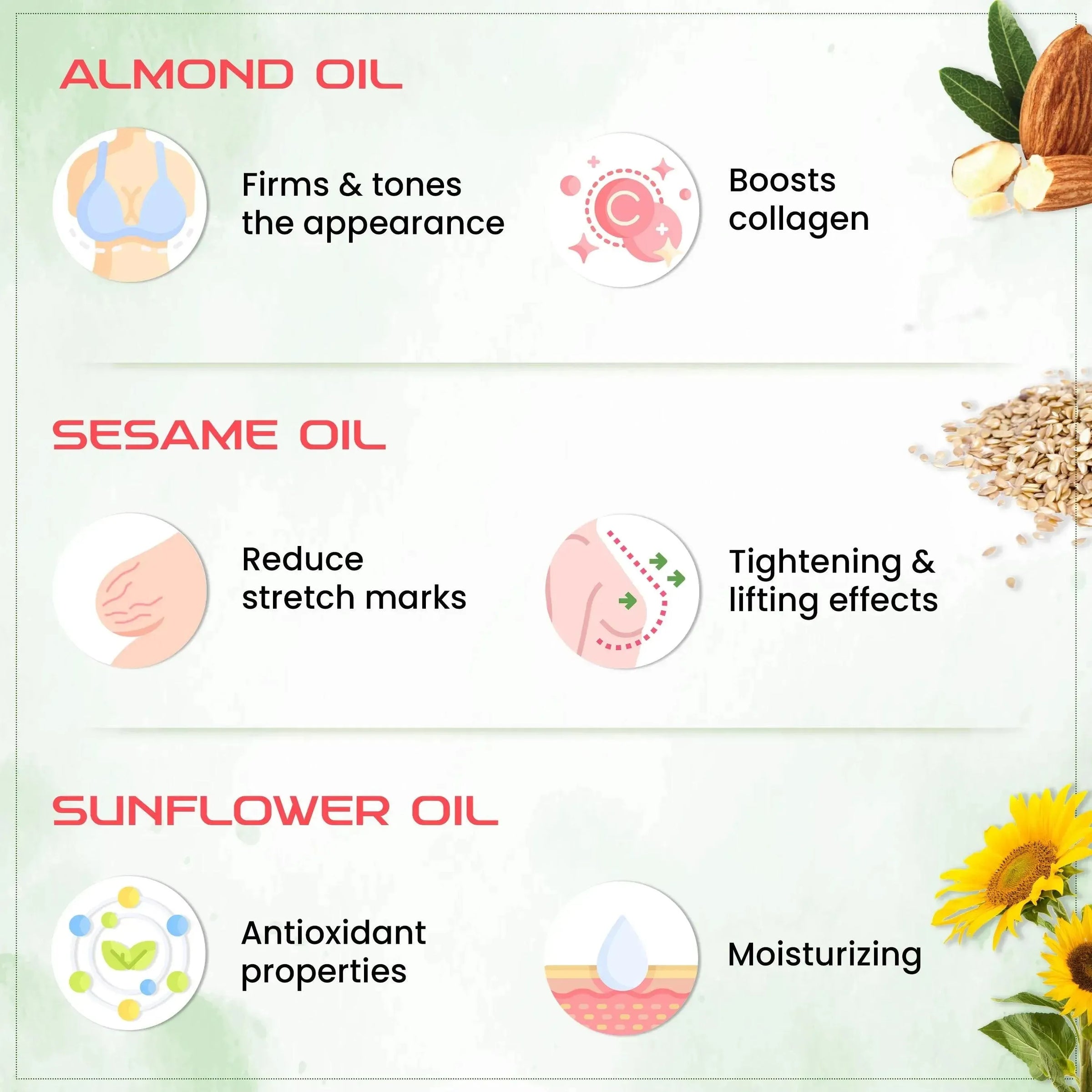 Packed with antioxidants, fatty acids, vitamins, and the anti-inflammatory properties of various oils it boosts collagen production, supplies nutrition & enhances breast & skin elasticity.