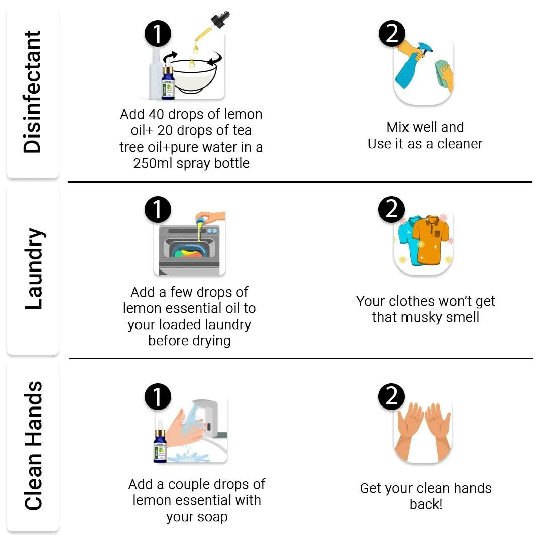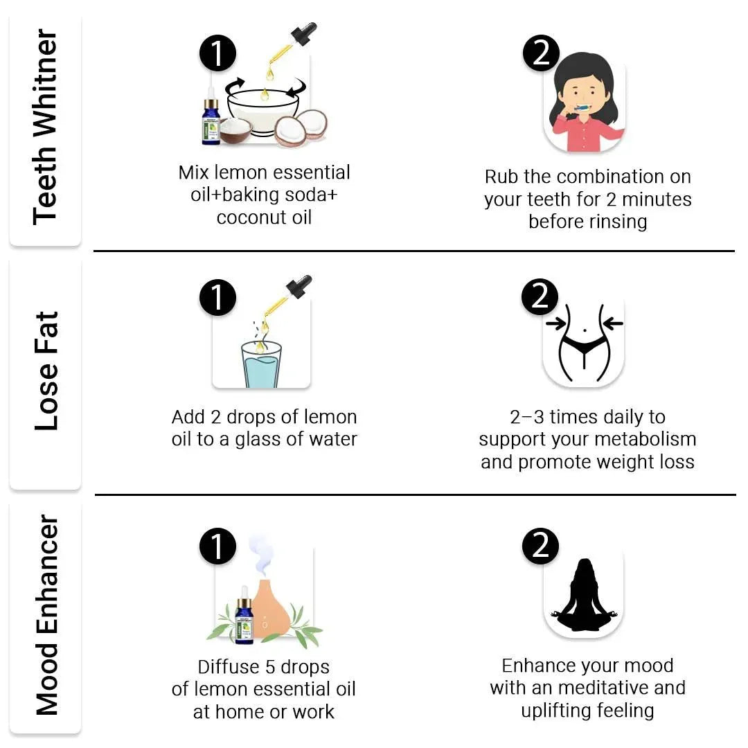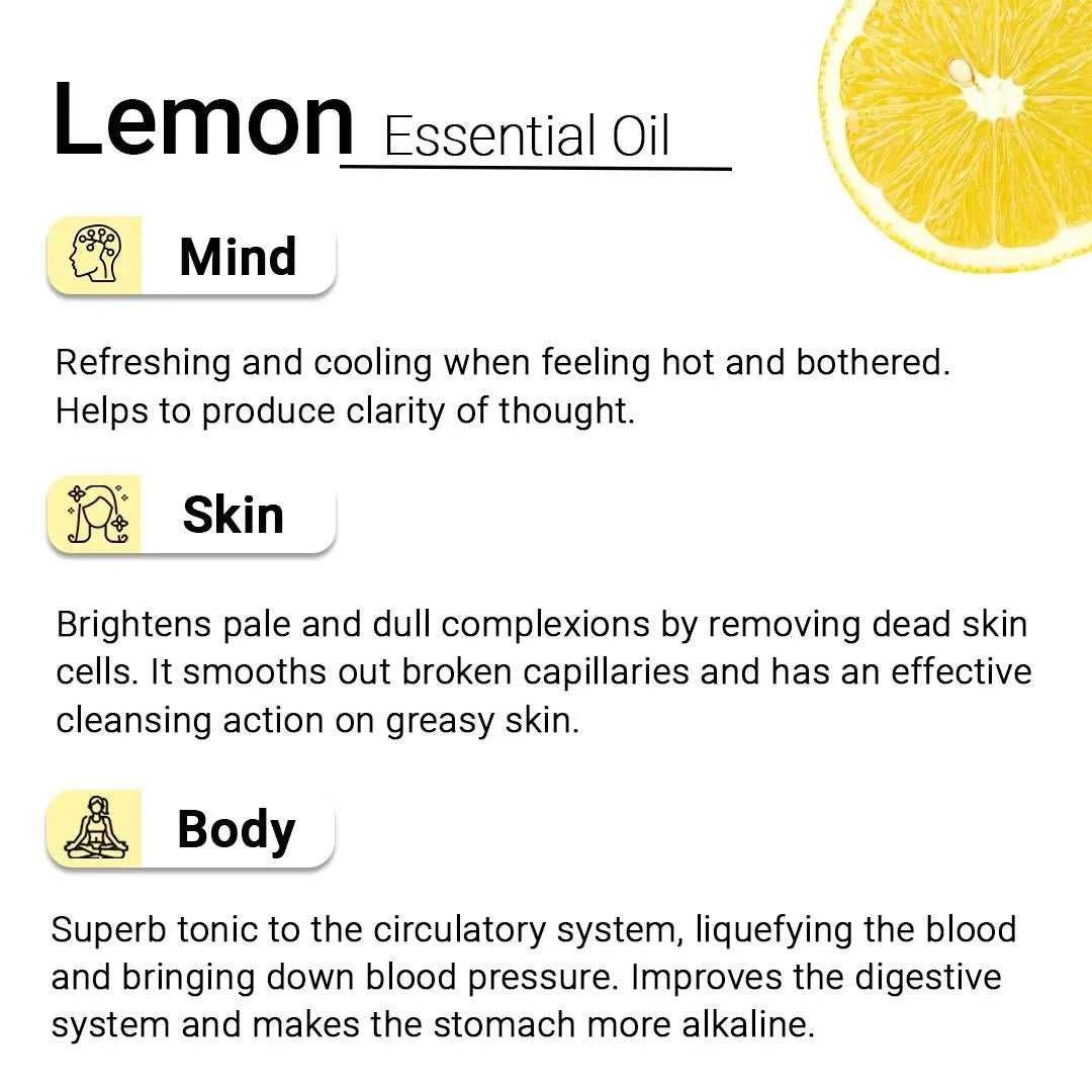 Our Lemon Essential Oil is 100% Pure, Organic, Therapeutic & Steam Distilled; It can be used in diffusers and inhaled directly with 4-5 drops in handkerchiefs for freshness and relaxation.
