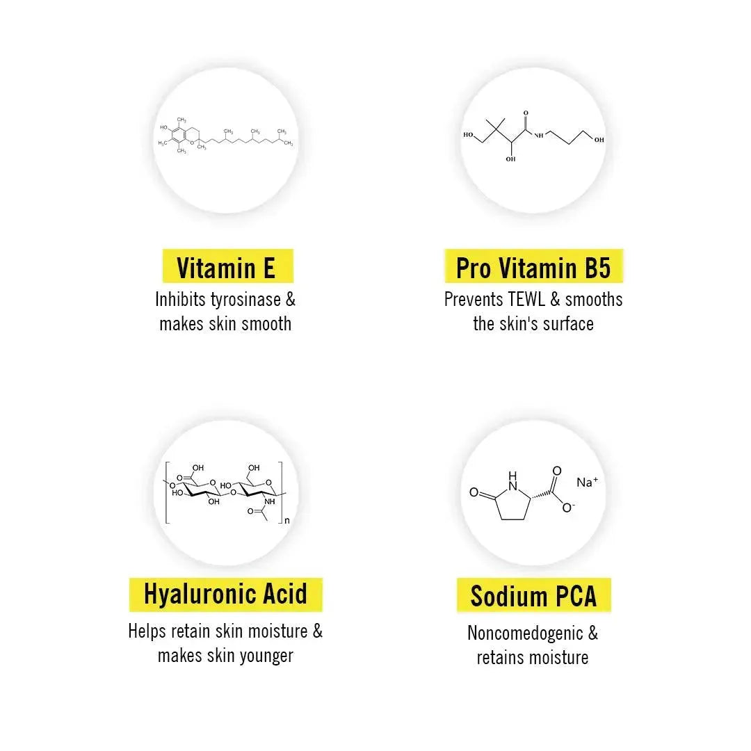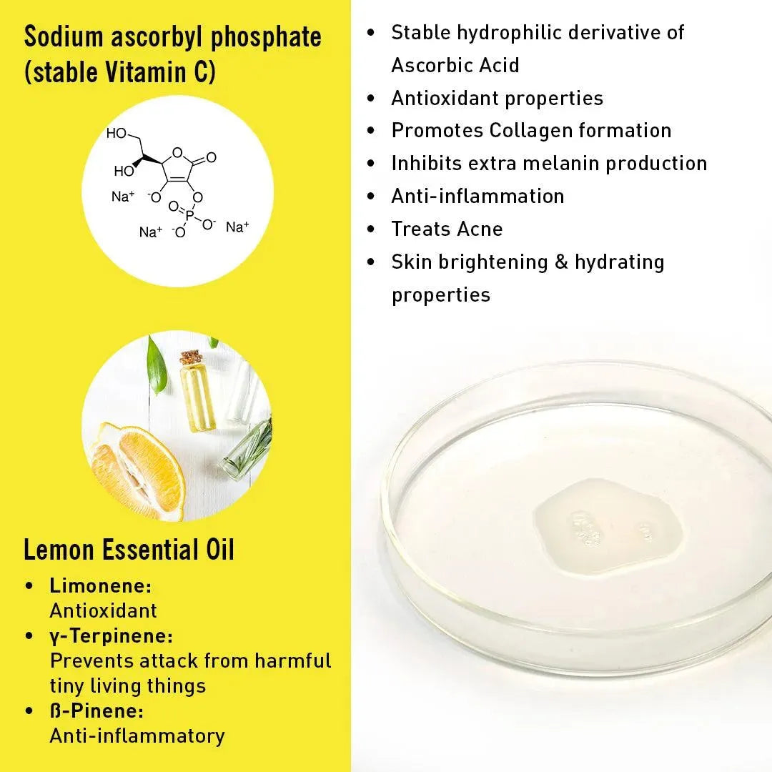 This serum targets dullness, acne marks, and blemishes, delivering a glowing complexion. Ingredients like Sodium Ascorbyl Phosphate (SAP) (stable Vitamin C), Lemon Essential Oil, Vitamin E, Pro Vitamin B5, Hyaluronic Acid, and Sodium PCA reduce acne marks, firm the skin, and provide hydrating, exfoliating, and brightening benefits.