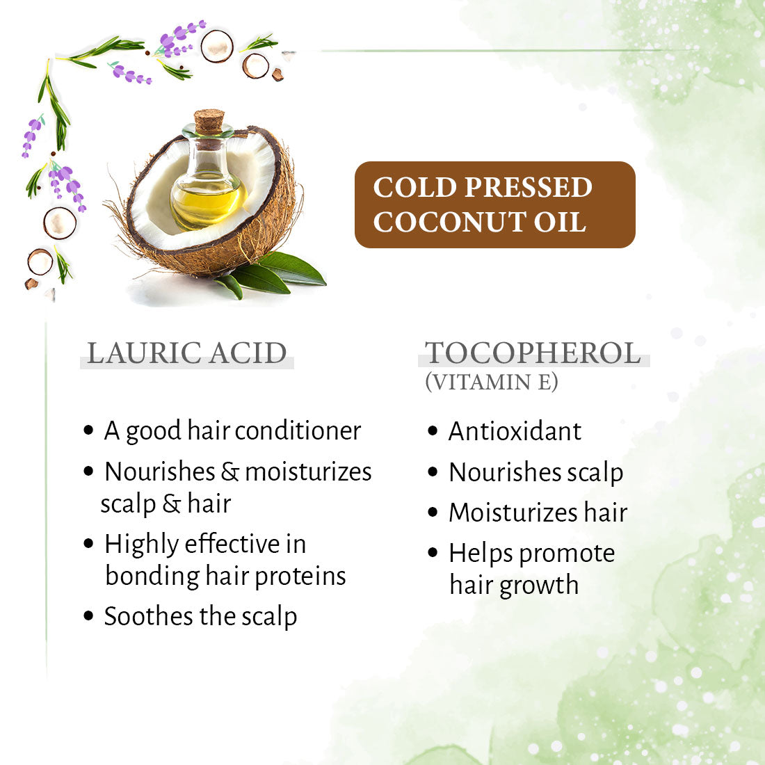 Coconut oil, which is enriched with lauric acid, is a natural emollient that moisturizes and nourishes hair, locks hair shaft hydration, and makes hair hydrated, smooth, and damage-proof. Lauric acid penetrates hair to keep it healthy.