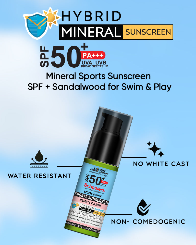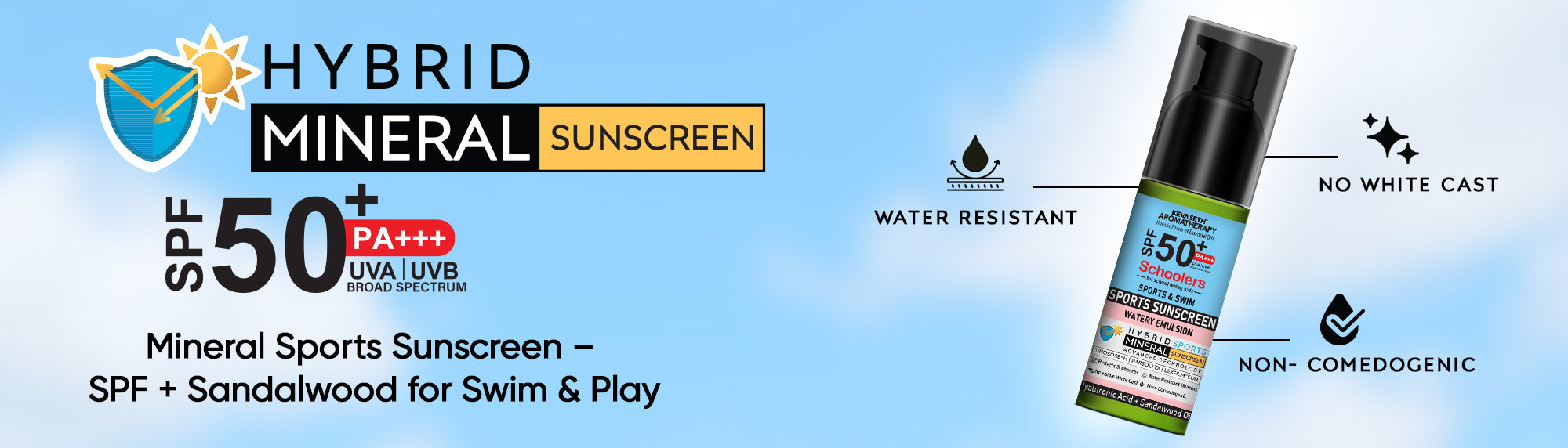 Schoolers Sunscreen : With SPF 30 PA++, Sandalwood Oil, and Olive Oil, the Kids’ Sunscreen Lotion Clears and Prevents suntan and keeps itches & rashes away. With Multivitamins, Olive Oil, Sandalwood Oil, and Tinosorb M, the Kids’ Sunscreen provide the broadest possible UV protection and shields against all forms of sun-induced damage. Safe on your child’s sensitive skin.