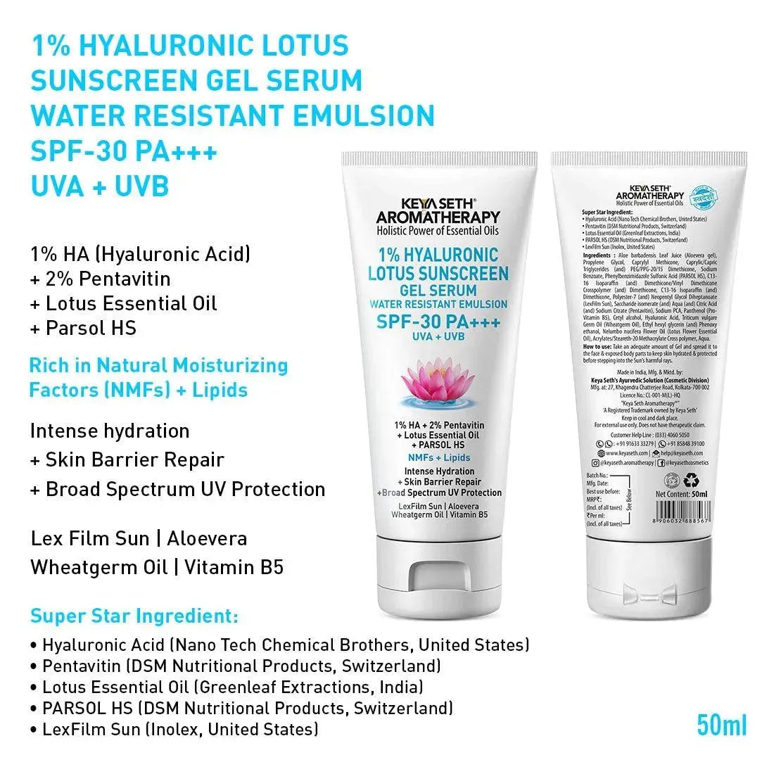 Powered by PARSOL HS & Lexfilm Sun, provide SPF 30+++ protection, UV defense, wash-off resistance, & hydration, all in a non-greasy Sunscreen Gel Serum.