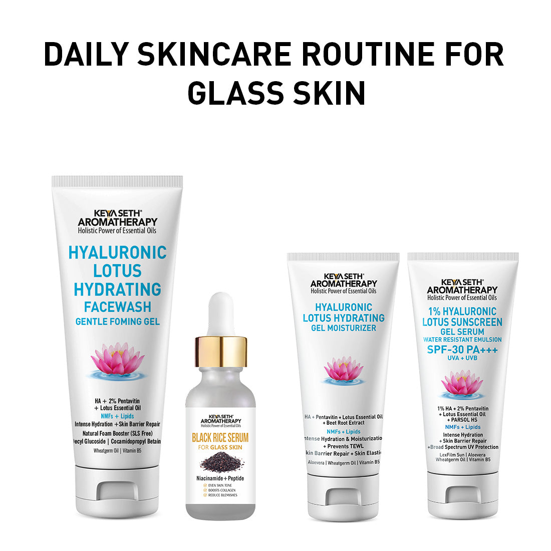 Daily Skincare Routine for Glass Skin – Hydrating Facewash, Black Rice Serum, Gel Moisturizer & Sunscreen for Radiance, Smoothness & Pore Reduction