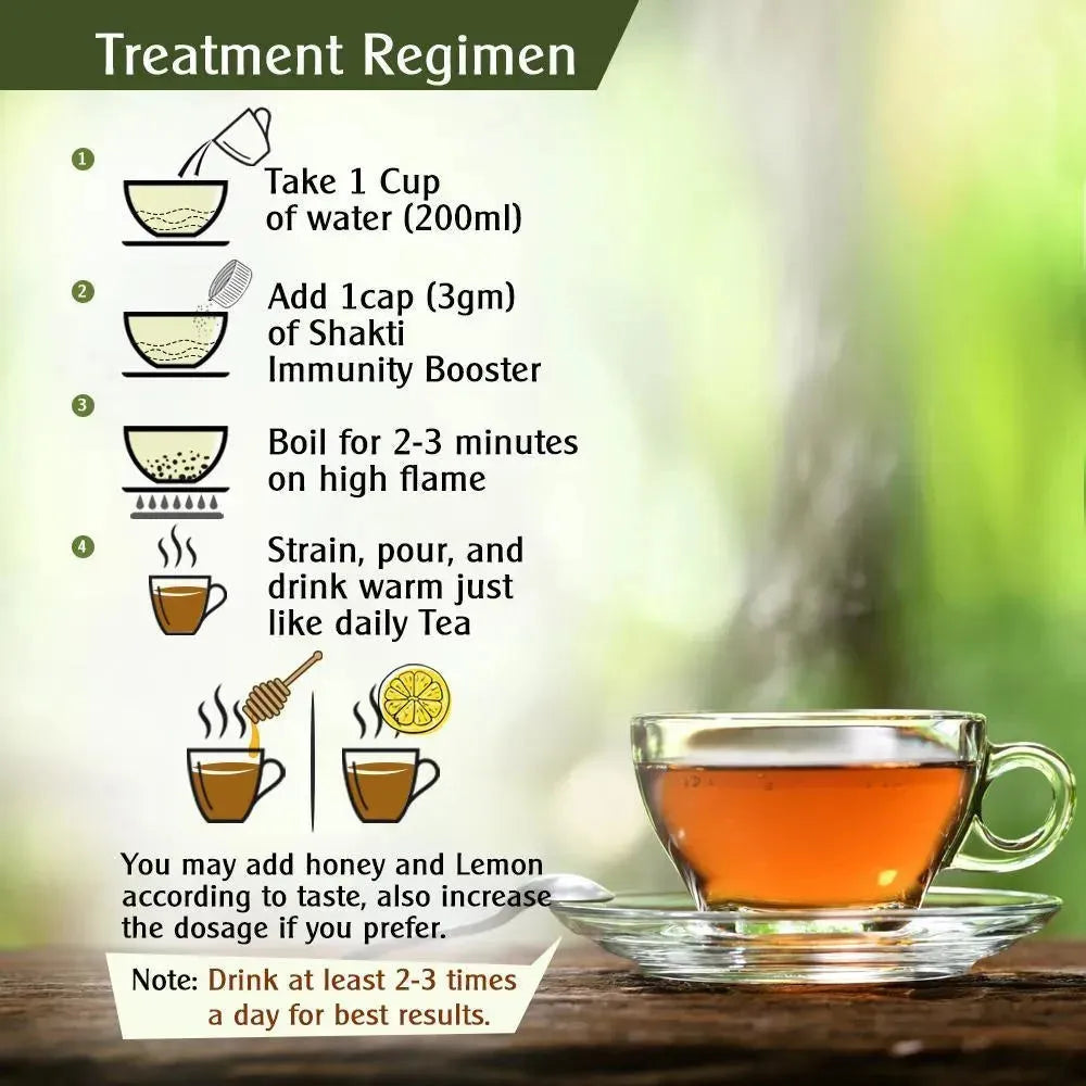 Take 1 cup water (200ml) add 1 cap (3gm) ‘Shakti’ in it and boil for 2-3 minutes on high flame. Strain and drink warm just like your daily tea. Drink at least 2-3 times a day for best results. You may add honey and lemon according to taste. You may also increase the dosage if you prefer.