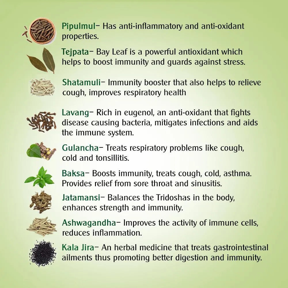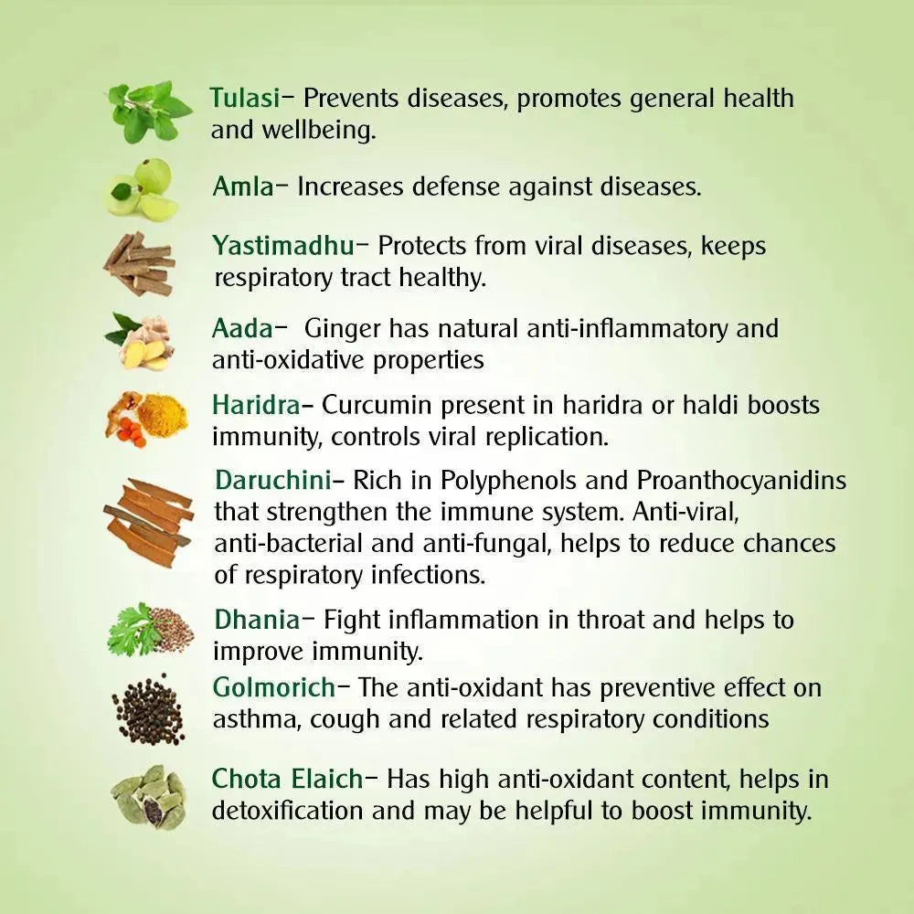 Ayurvedic 100% Natural Herb TEA enriched with Tulsi, Amla, Yastimadhu, Haldi, Adda, Daruchini, Haridra,Dahnia, Chota Eliach ,Kala Jira, Tejpata, Lavang, Pipulmul, Shatamuli, Gulancha ,Baksa, Jatamasi, Ashvagandha helps to boost Immunity.