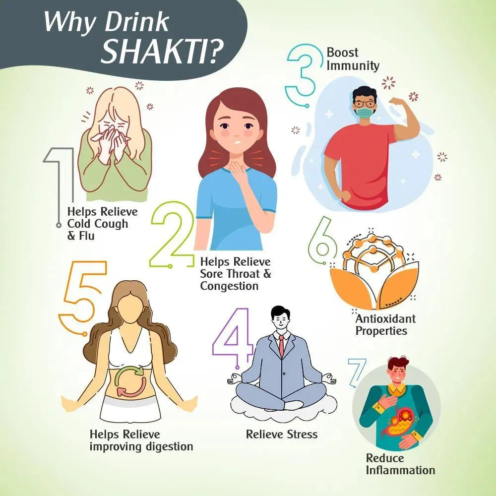 Boost your natural immunity and get protection from cold flu respiratory infection with SHAKTI. This Ayurvedic Kadha Powder contains 18 Ayurvedic immunity-boosting ingredients that kill infection-causing microbes, softens throat, mucus clears, respiratory passage, alleviates inflammation of the throat and respiratory tract promoting overall better health. Also helps to quickly relieve the symptoms of cold, cough, and flu.