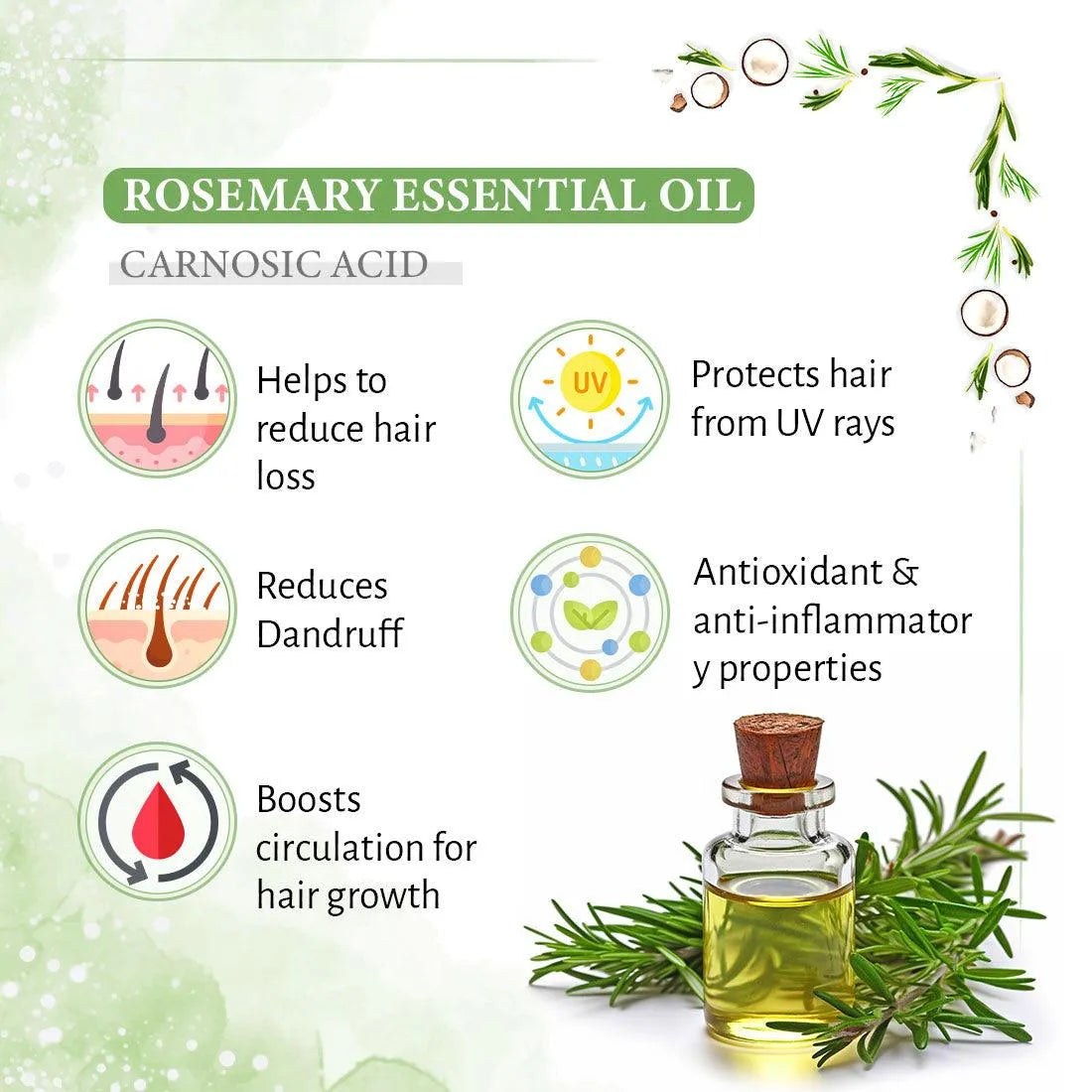 Rosemary Essential Oil encourages hair growth by blocking hair loss’s underlying cause. A high amount of Carnosic acid rejuvenates the scalp, promotes growth & controls hair loss.