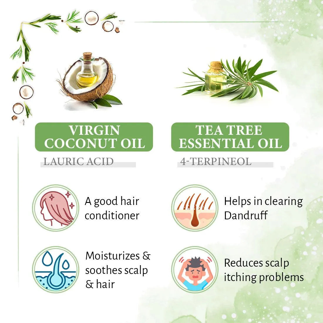 Tea tree oil with 4-terpineol soothes the scalp, while coconut oil's lauric acid controls harmful agents. Both reduce itching & dandruff, & Tea Tree Oil also combats head lice.