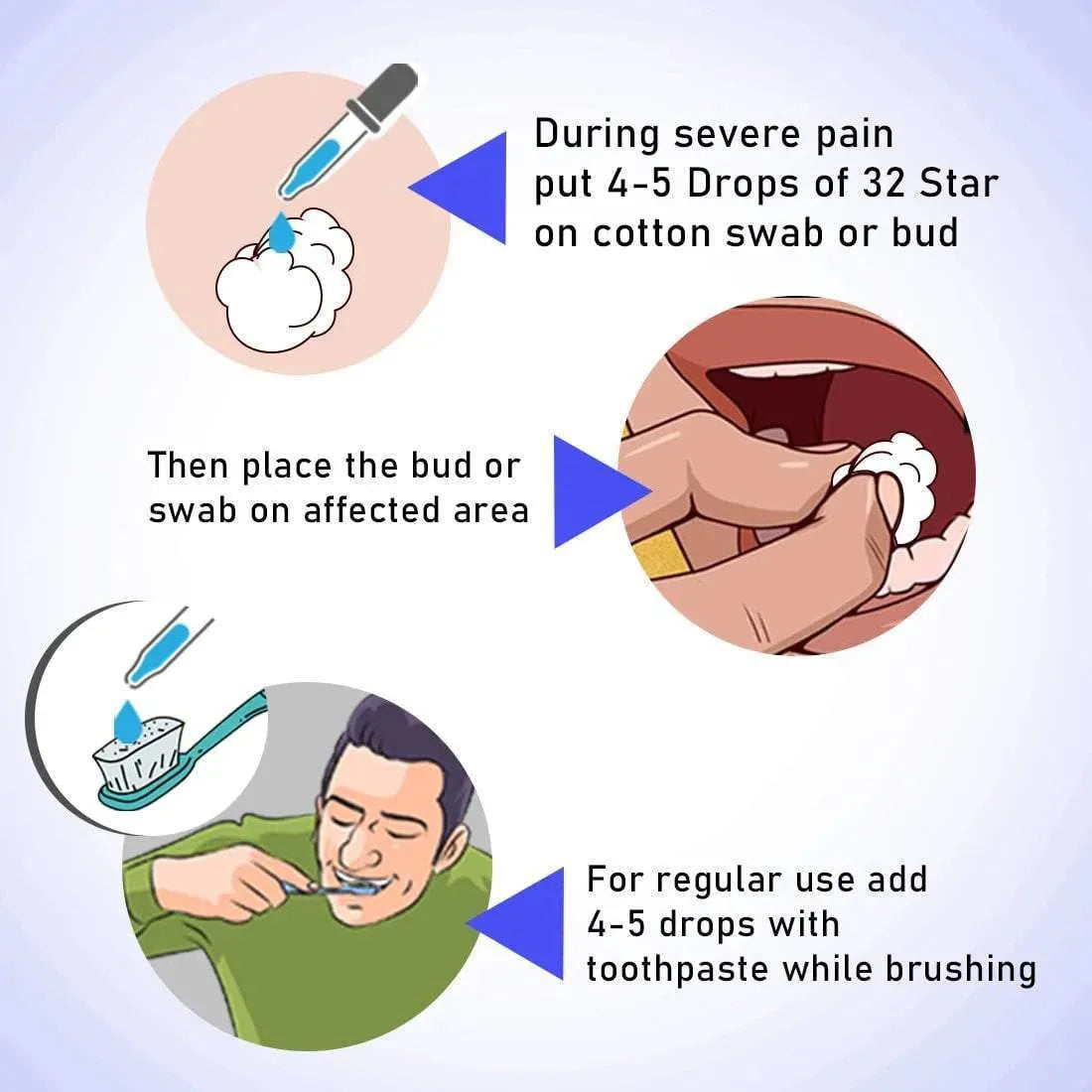 During severe pain, put 4-5 drops of 32star on a cotton swab or bud, then place the bud or swab on the affected area. For regular use, add 4-5 drops with toothpaste while brushing.