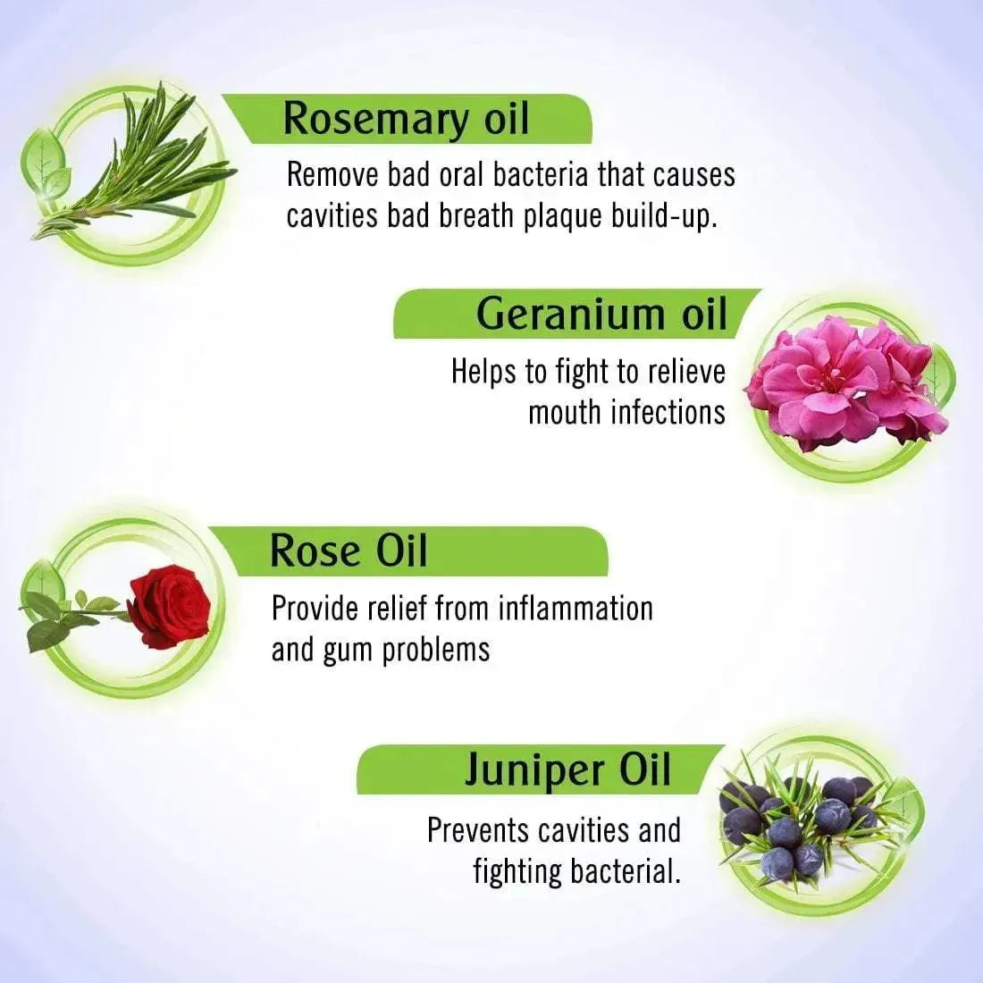 Tea tree & Cypress oil has Anti-viral and Astringent properties that help to fight gum disease & bleeding gums. Peppermint Oil & Clove oil has antimicrobial properties to treat toothache & reduces bad breath. Geranium oil & Rosemary Oil helps to fight to relieve mouth infections and bad oral bacteria. Lemon oil & Rose Oil Prevent receding gum pains and tooth decay. Juniper Oil can help to prevent cavities and fight bacteria.
