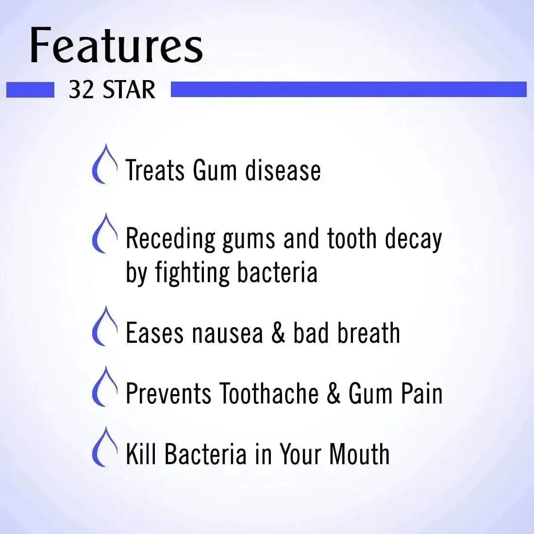 “32 Star.” is made with Nine powerful essential oils, which are long known as healthy Tooth & Gum Care