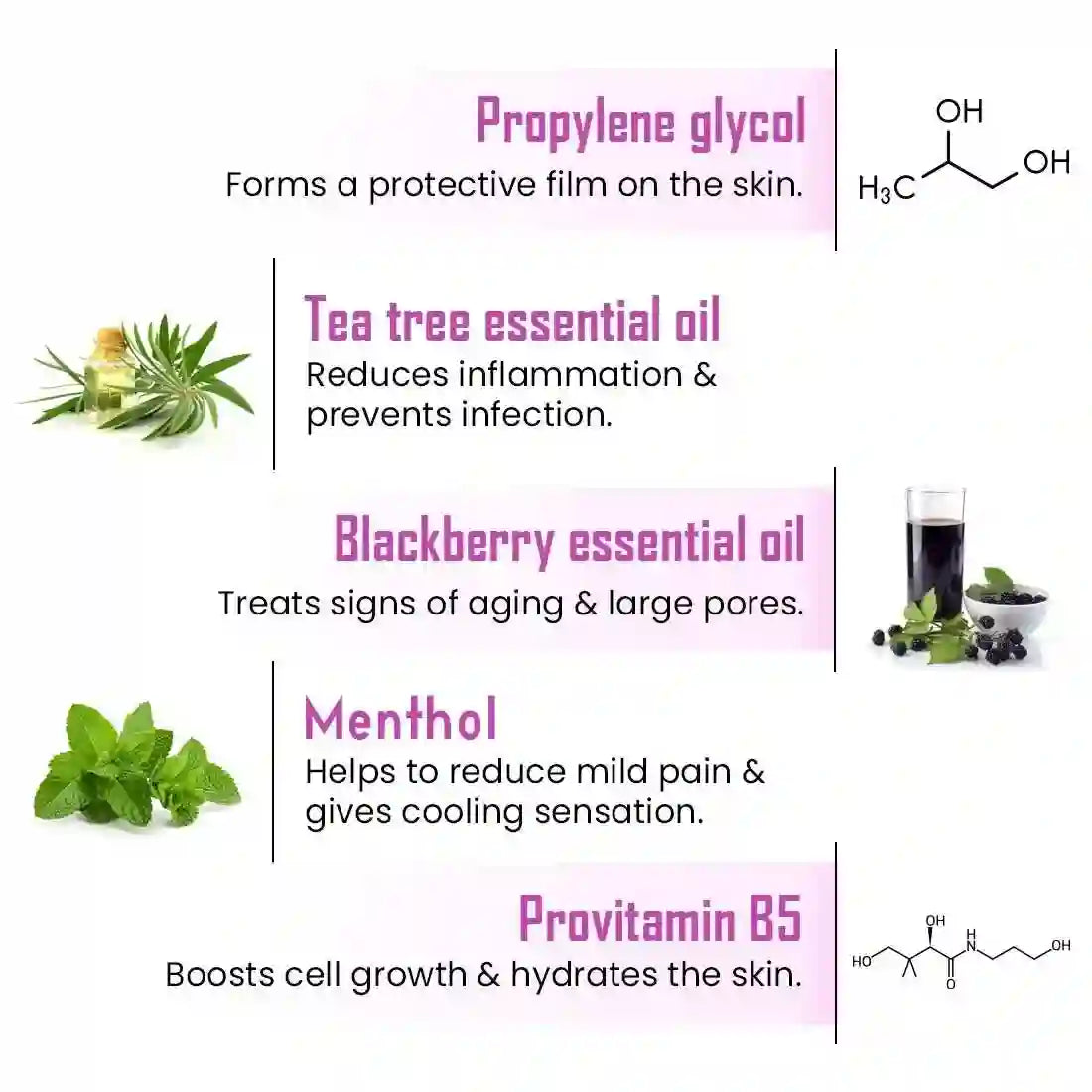Execllent for combination and oily skin, enriched Blackberry oil, Menthol, Tea tree oil, Pro-Vitamin B5 and Propylene Glycol, gently exfoliates, calms irritated skin, fights acne, slows photoaging and balances natural oil.
