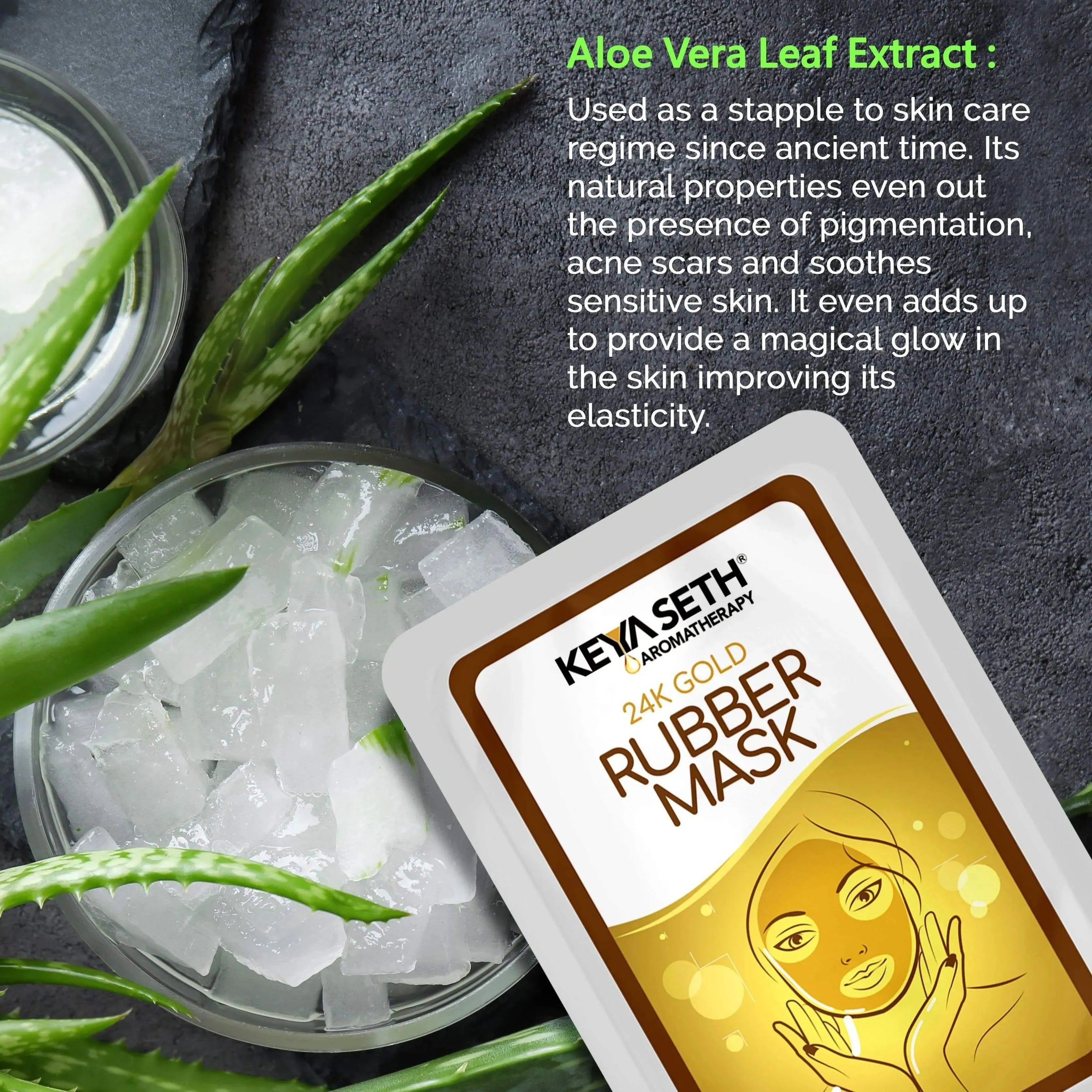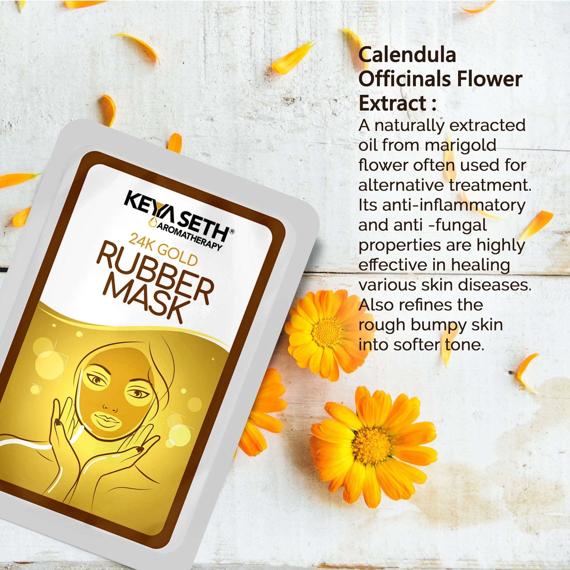 The Gold Facial Mask is a magical blend of 3 Natural Extracts — Aloe Vera provides Long-Lasting Moisture Retention; Calendula Preserves Skin Health with Its Antiseptic & Anti-Inflammatory Properties; Chamomile Neutralizes Free Radicals while Revitalizing & Re-energizing Skin.