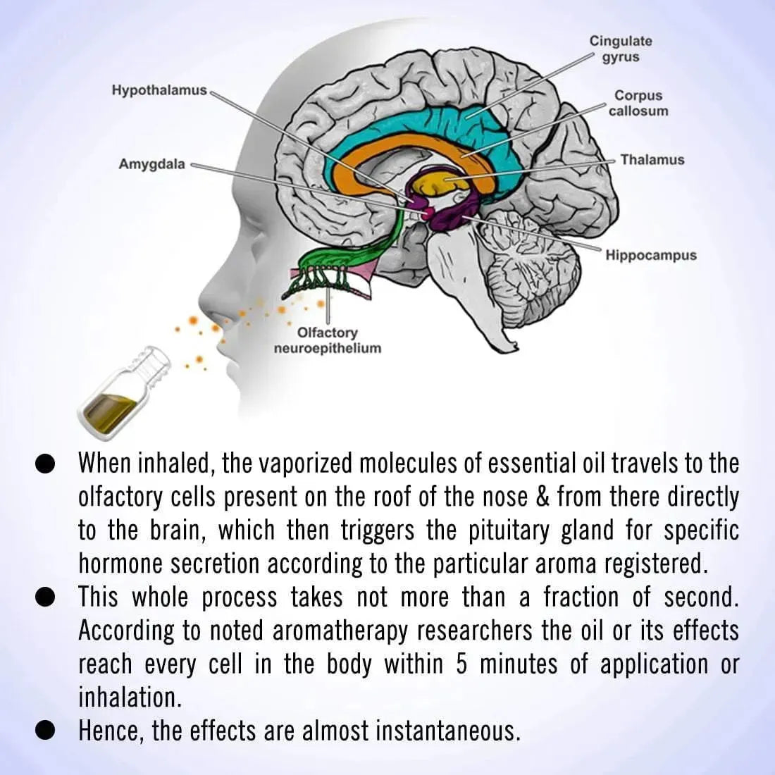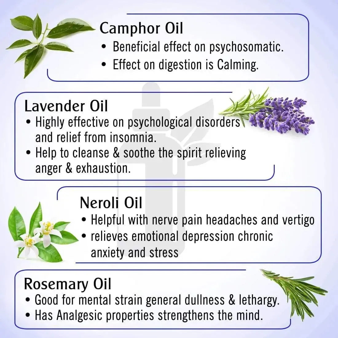 Combined with 8 Essential oil, Lavender appears to cleanse the Spirit relieving anger & exhaustion; Peppermint has cooling action that seems to ease headache & sinusitis; Eucalyptus reduces the painful effects of migraines, Aniseed could invigorate a tired mind; Neroli helps to relieve chronic anxiety & stress; Basil seems to have an uplifting effect on depression; Rosemary is good for mental strain general dullness; Camphor has a beneficial impact on psychosomatic