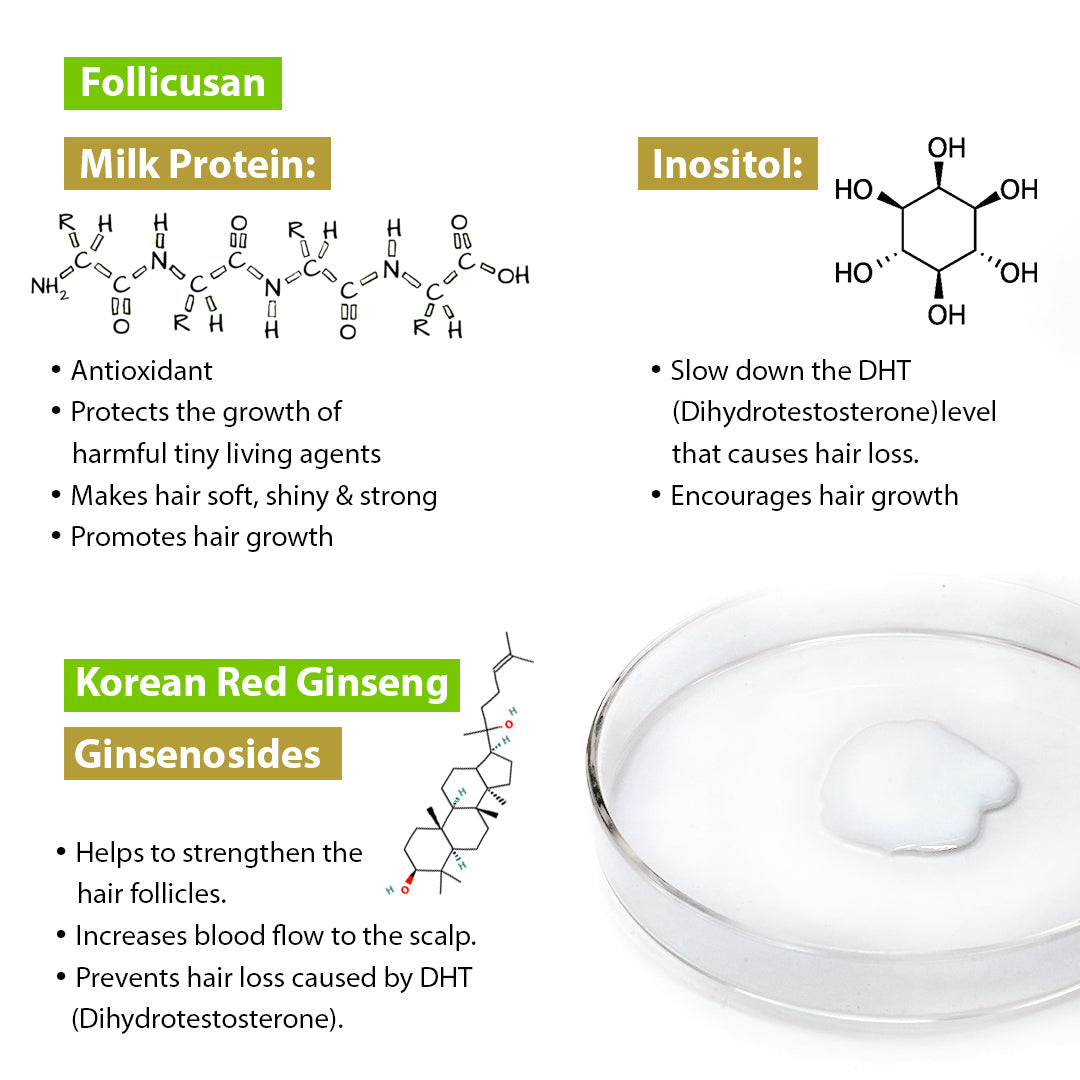 Enriched with Inositol & Korean Red Ginseng & Caffeine, it increases new hair growth, reduces hair loss by blocking DHT, & strengthens hair follicles with antioxidants & nourishing properties.