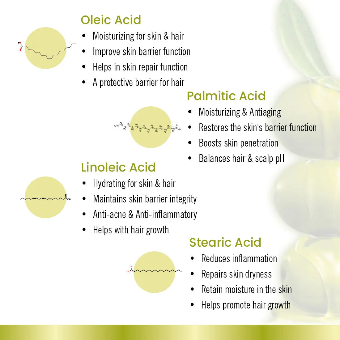 Olive Oil is formulated with pure olives enriched with Linoleic Acid, Oleic Acid, Palmitic Acid, etc., which help develop a barrier against harmful bacteria & skin irritants, helpful for acne-prone skin, and prevent premature aging.