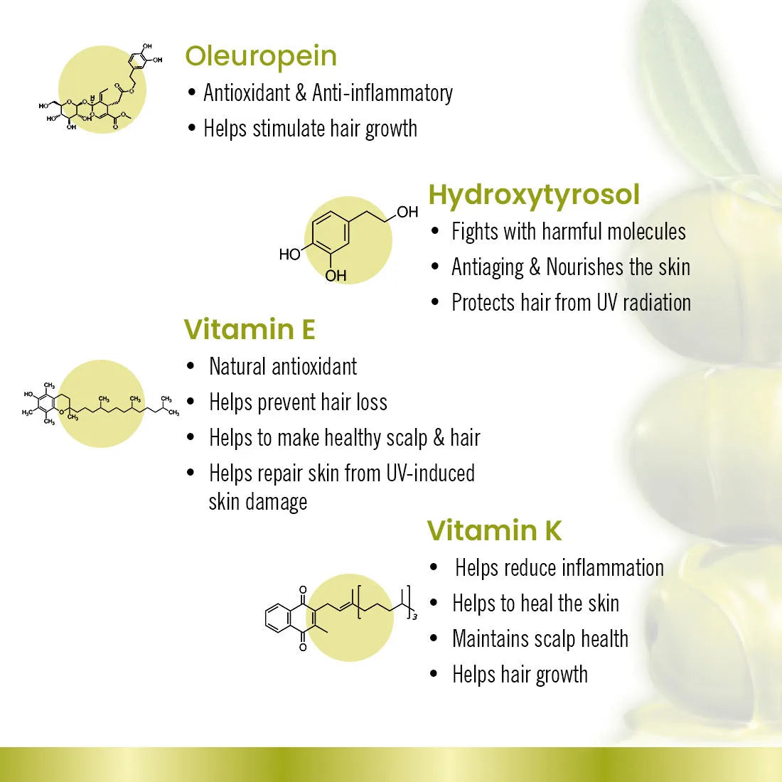 Olive Oil with vitamin E keeps skin moisturized, and vitamin K helps remove scars, dark circles, and stretch marks.