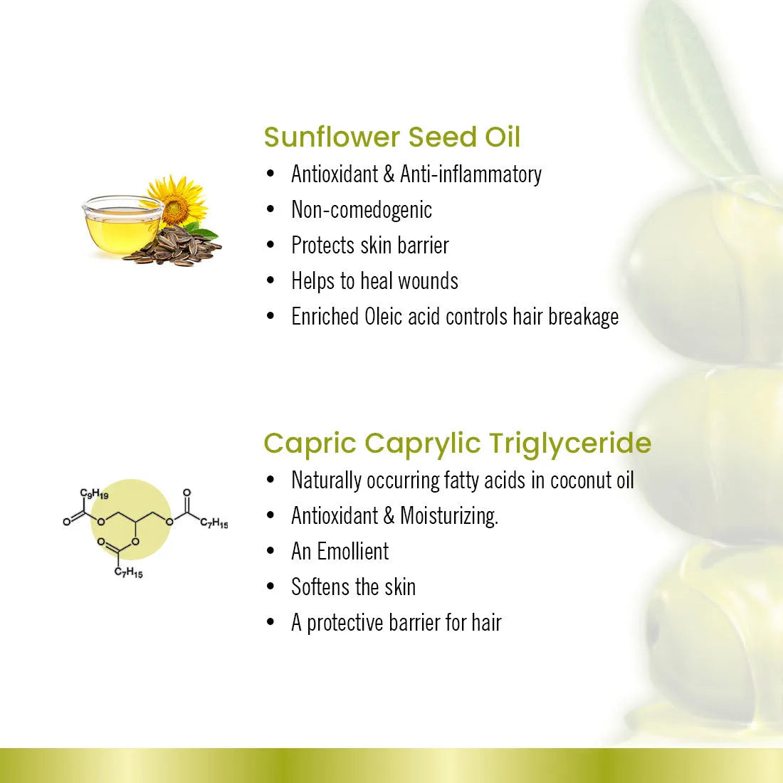 Enriched with the goodness of Vitamins E & K, Sunflower Seed Oil & coconut-derived Capric Caprylic Triglyceride soften the skin and reduce acne, under-eye puffiness, and stretch marks.