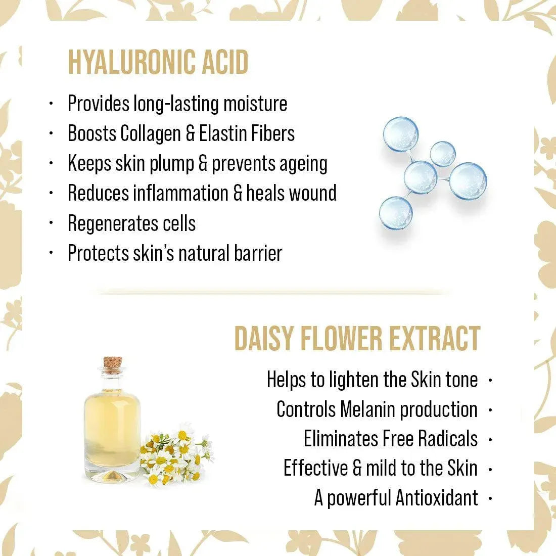 With the natural ingredient, Daisy Flower Extract corrects skin concerns from the inside; it calms and soothes the skin, reducing the appearance of blemishes, dark spots, discoloration & loss of skin elasticity. It is rich in antioxidants, along with malic and tartaric acids. These acids assist in skin firming and provide an even and luminous complexion. It helps to control the activity of tyrosinase & production of melanin, which is the reason for free radicals' damage & blackening spots