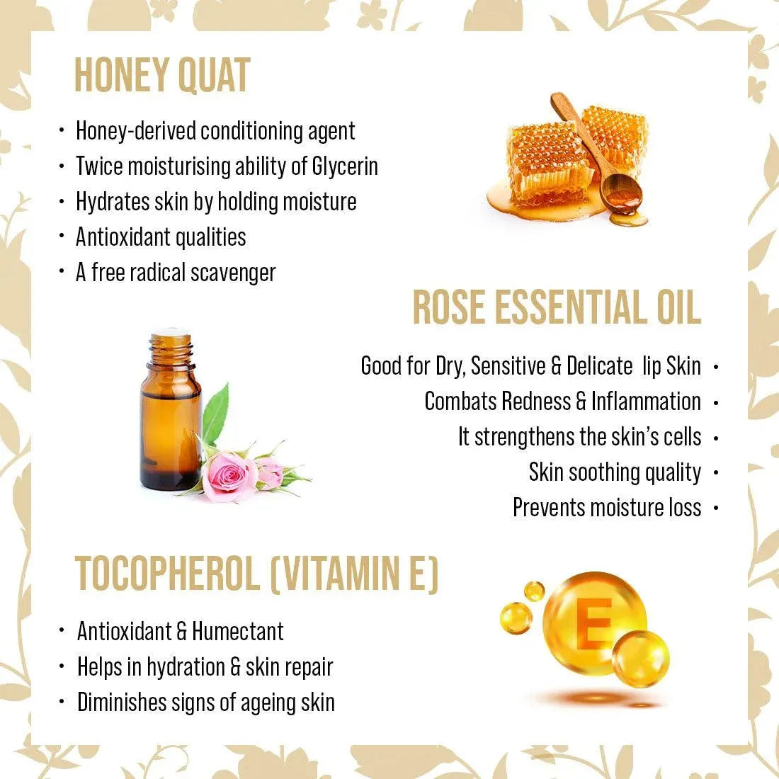 Important Constituents like Geranic (Acid), Citronellol, Geraniol, Nerol (Alcohols) & Myrcene of the Rose Essential Oil are good for Dry, Sensitive & Delicate lip Skin. It is a natural humectant that helps keep the skin hydrated. It draws moisture from the air and seals it into the skin. It combats Redness & Inflammation and strengthens the skin’s cells. Its tonic & soothing quality is helpful for sensitivity as it will help to keep the skin hydrated and prevent flakiness
