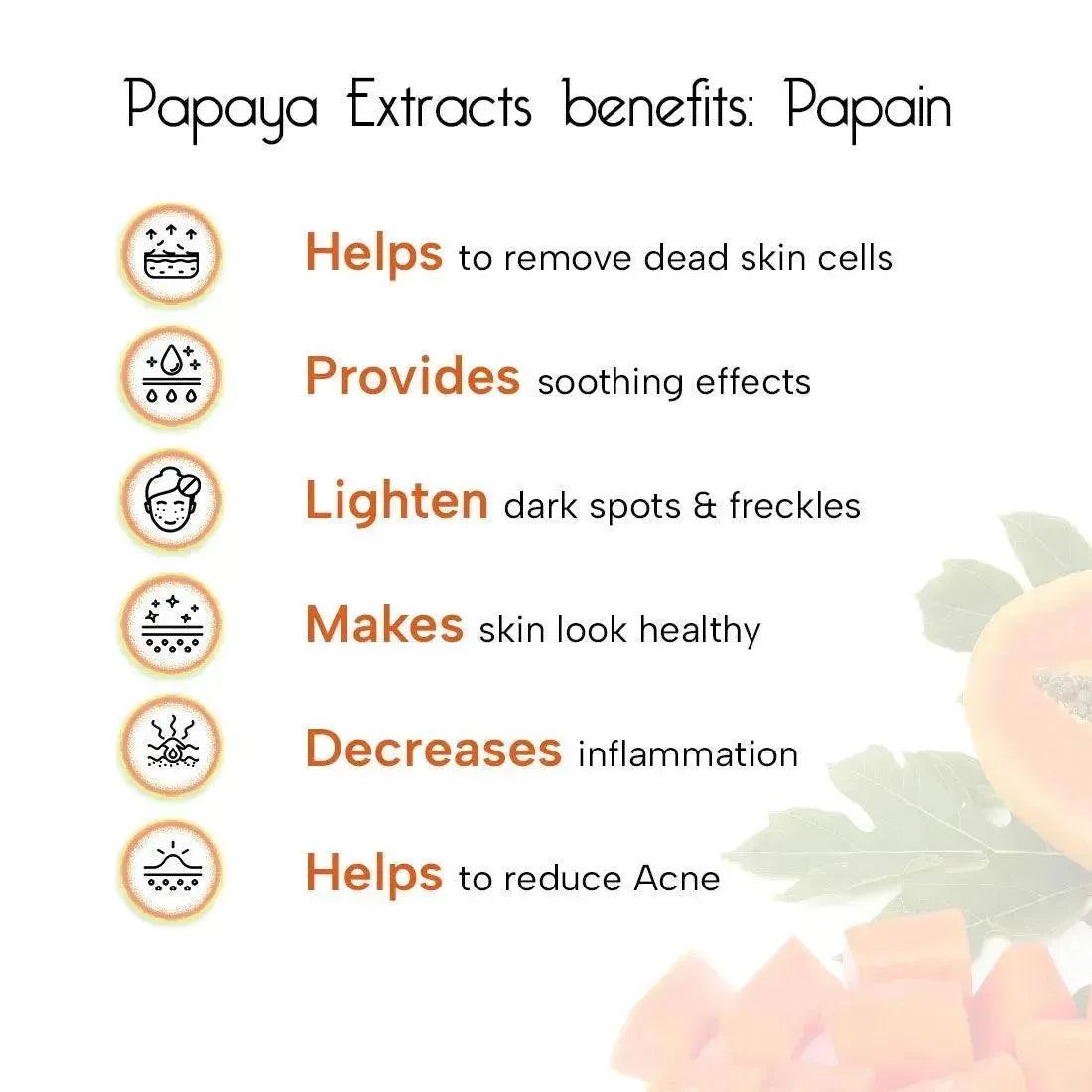 Rich in many Vitamins like A, C & Phyto-vitamin K. In addition to these vitamins, it also has Micro-minerals like phosphorus, magnesium & beta-carotene. Enzymes like beta-carotene, Vitamins & phytochemicals in papaya have skin-lightening properties. A proteolytic (breakdown protein) enzyme, Papain helps reduce freckles or brown spots due to exposure to sunlight, smoothing the skin and creating healthier-looking skin. Papaya helps skin elasticity & firmness by minimizing wrinkles appearance.
