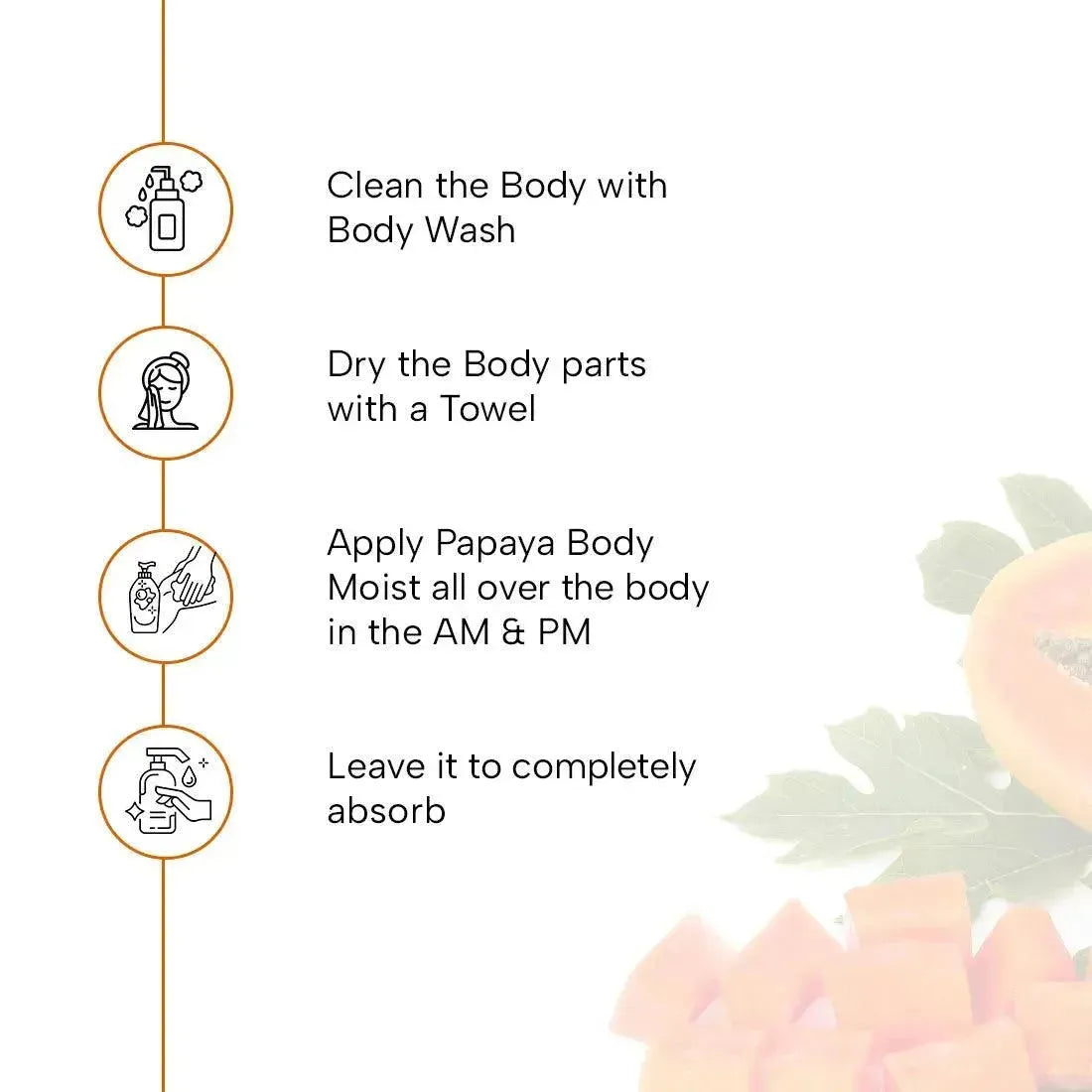 After Body wash apply the appropriate amount of Papaya Body moist all over the clean & dry body in AM to protect the skin from harmful sunrays. Leave it for a few minutes to completely absorb the skin. Apply it at night for blemish-free, even-toned & bright skin.
