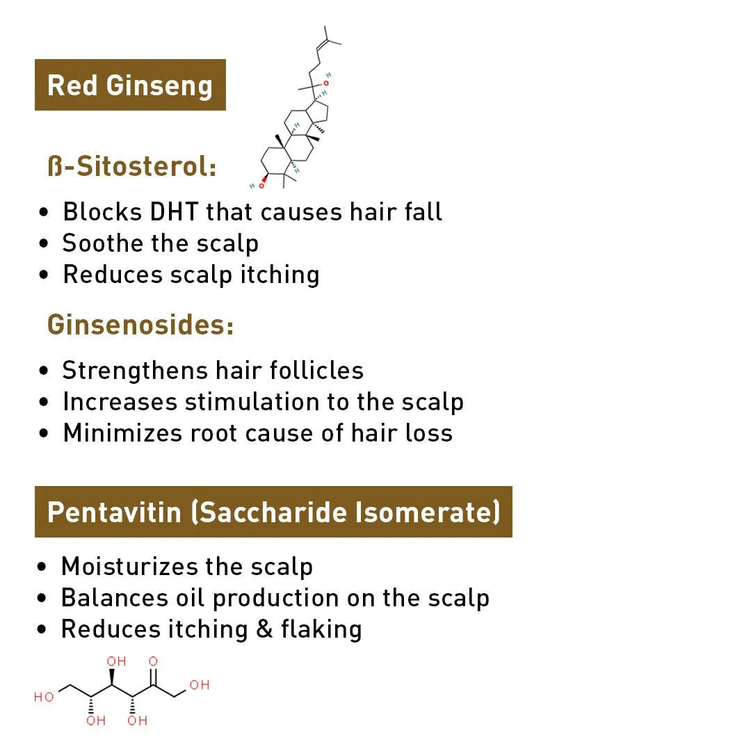 Red Ginseng improves nutrient flow, Pentavitin nourishes the scalp & hair, Caffeine stimulates follicles, & Vitamin E nourishes the scalp & protects damage by enhancing hair’s strength & shine.