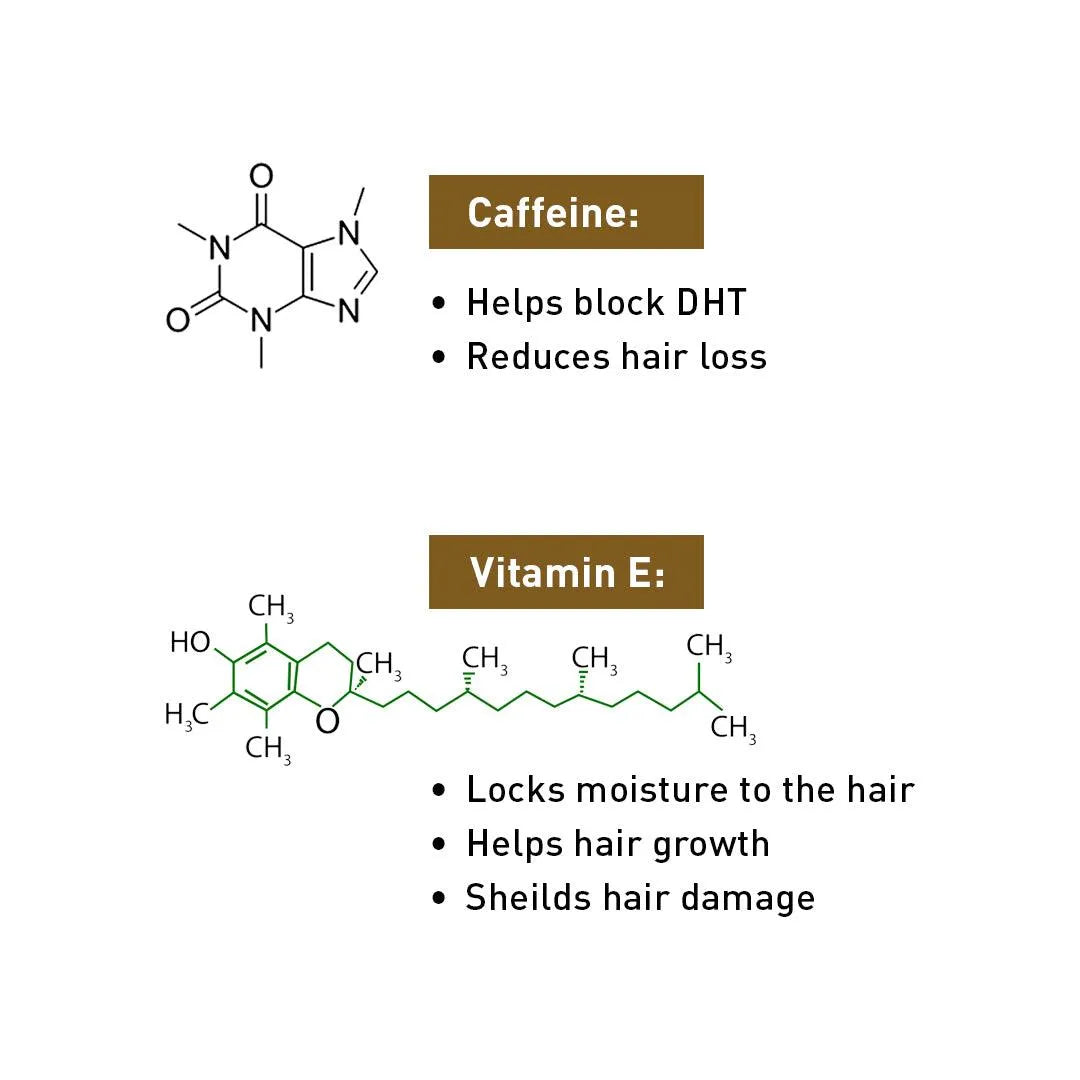 Rich in Ginsenosides, it regulates proteins that manage hair cycles, & shields loss by initiating growth & delaying shedding phases. Caffeine encourages the hair follicle to reduce hair loss & antioxidant Vitamin E helps hair grow.