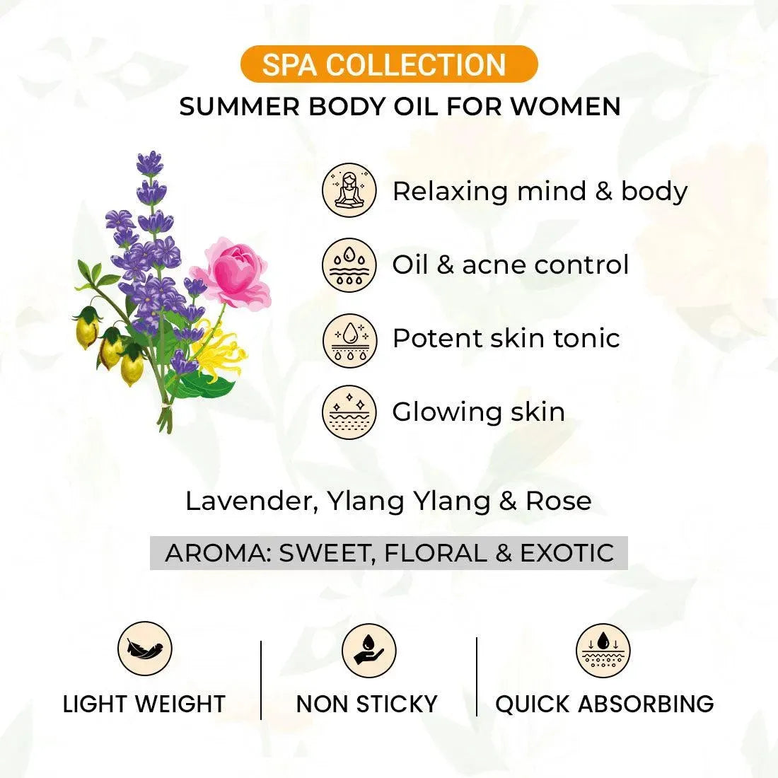 Relaxing Floral Summer Body Oil Non-Sticky & Quick Absorbing for Women, Potent Skin tonic for Glowing Skin, Oil & Acne Control, Relaxing Mind & Body