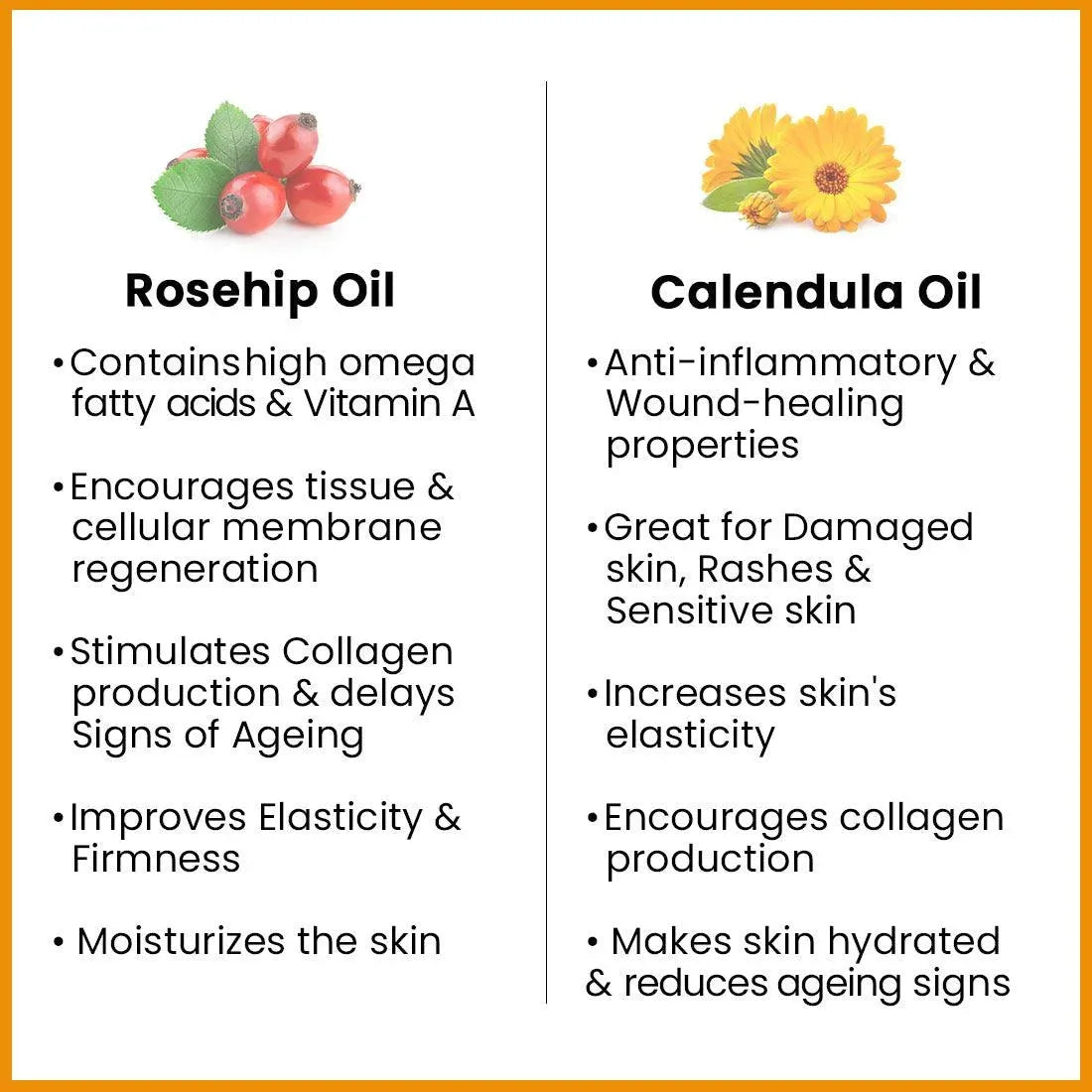 Rosehip Oil is an Excellent Moisturizer. It's a nice emollient, moisturizing plant oil loaded with skin-nourishing fatty acids which fortify the skin barrier & Oleic acid is helpful for Dry skin because it penetrates & replenishes lost moisture. Anti-inflammatory & Wound healing properties of Calendula Oil calm & soothe the skin providing maximum hydration & recovers damaged skin to give protection from Free Radicals and provide brightening effects