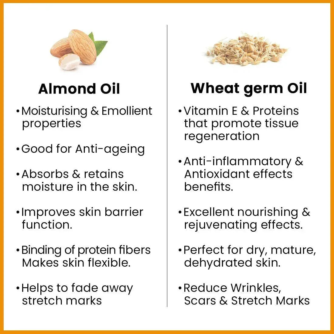 It improves Elasticity & Firmness by encouraging Collagen production to lighten Stretch Marks due to rapid growth or weight gain, resulting in insufficient collagen production. Calendula Oil also helps to promote skin renewal & increase skin elasticity & is excellent for preventing skin stretch marks. Fatty acids, Vitamins, Proteins & Minerals properties of Almond & Wheatgerm Oils bind the Protein fibers & make skin flexible & help to fade away Stretch marks