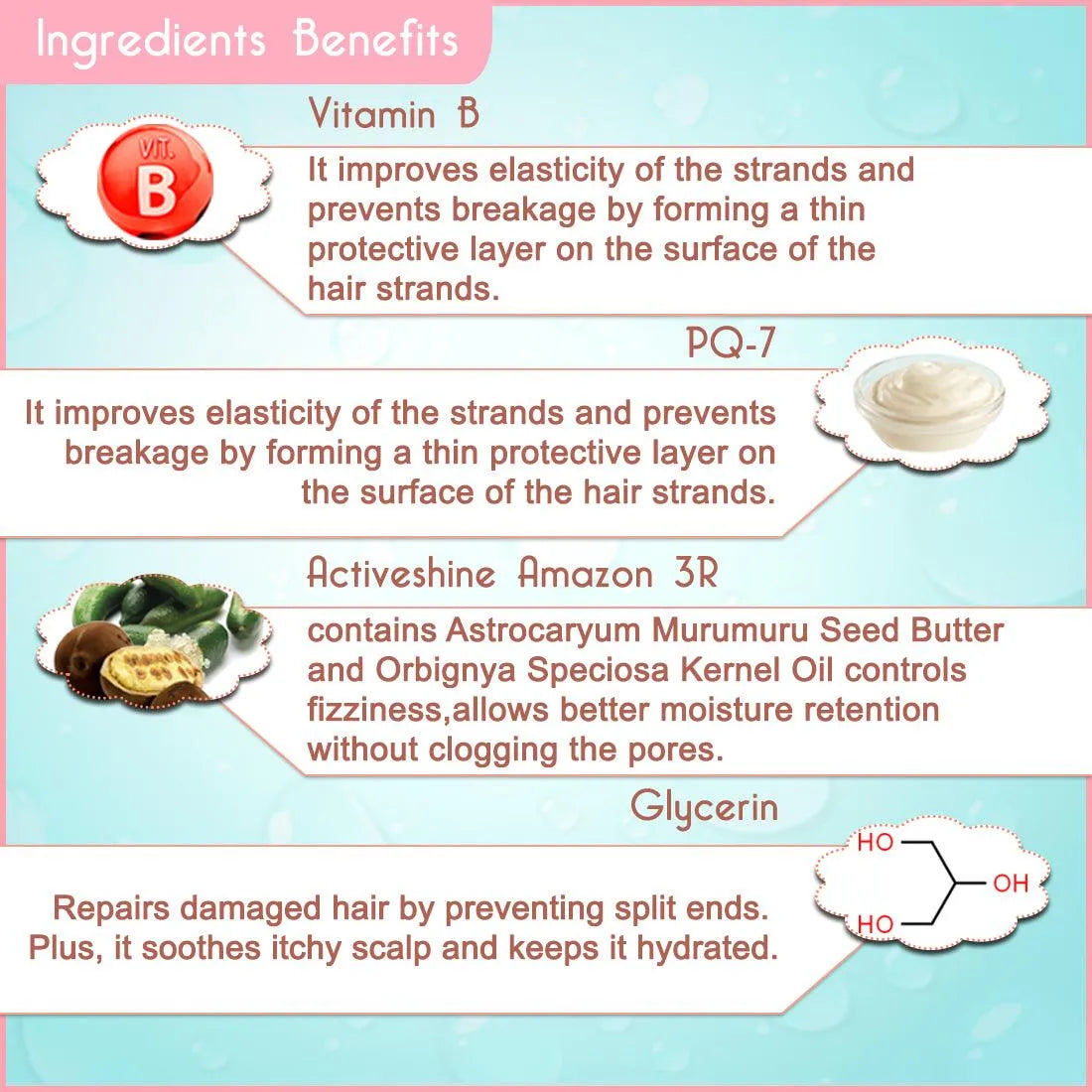 The Kids’ Shampoo and Conditioner for hair growth is loaded with four major magic ingredients — Active Shine Amazon 3R removes dandruff, adds shine to hair, moisturizes the dry scalp, and helps grow thicker strands. Glycerin acts as the humectant to hair and treats rough and frizzy hair by restoring hydration; PQ-7 (conditioner) detangles hair, adding softness and shine; Vitamin B (D-Panthenol) takes care of hair health by forming a protective layer on the hair strands.