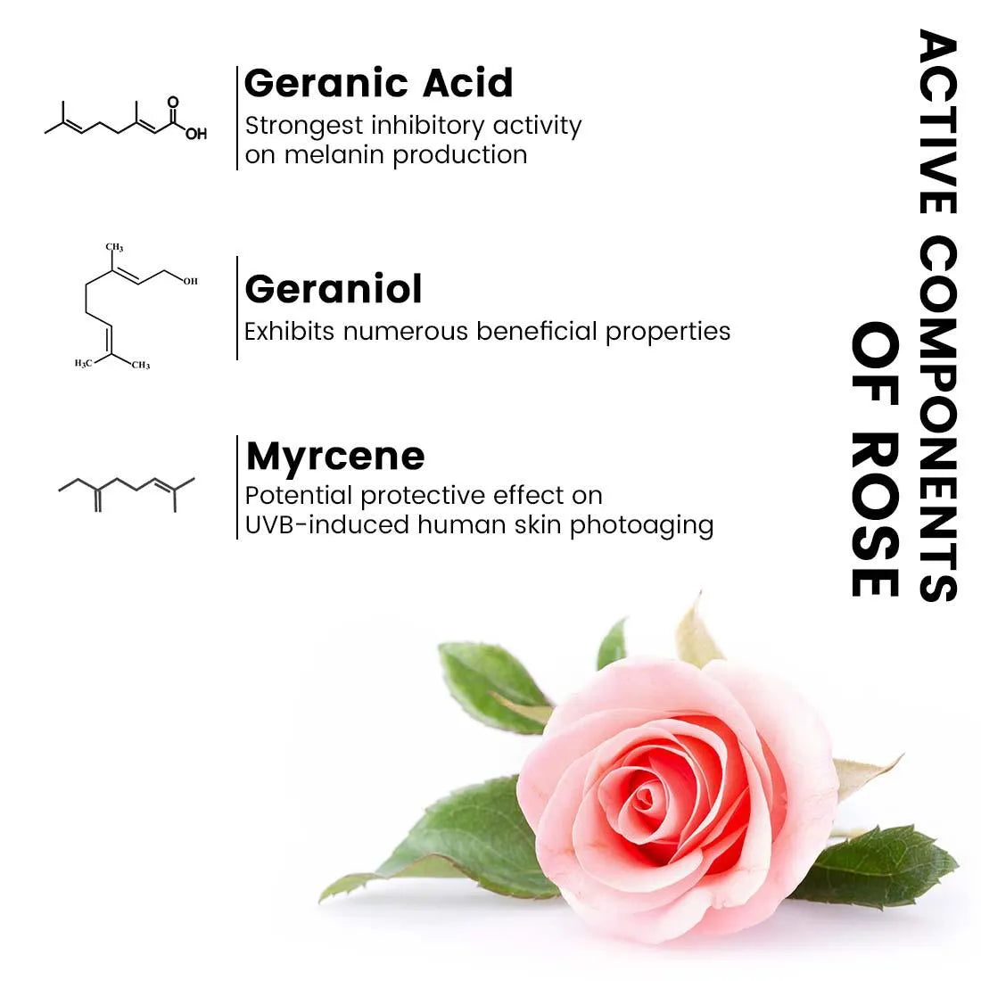 Rose Essential Oil: High-quality, pure Rose Essential Oil is obtained from the fresh petals of flowers in a highly elaborate & delicate process. Rose essential oil contains several vital Vitamins, Minerals & Antioxidants that replenish the skin & protect it from the elements. Its tonic & soothing quality is helpful for inflammation & constricting action is a valuable treatment for broken thread veins.Rose oil softens dry patches, improves the skin’s elasticity, reduces inflammation & promotes healing. Antioxidants protect the skin against free radicals & prevent oxidative stress damage. Antibacterial soothes acne inflammations & fades old acne marks & dark spots. It purifies & even out your skin tone & brightens your complexion.