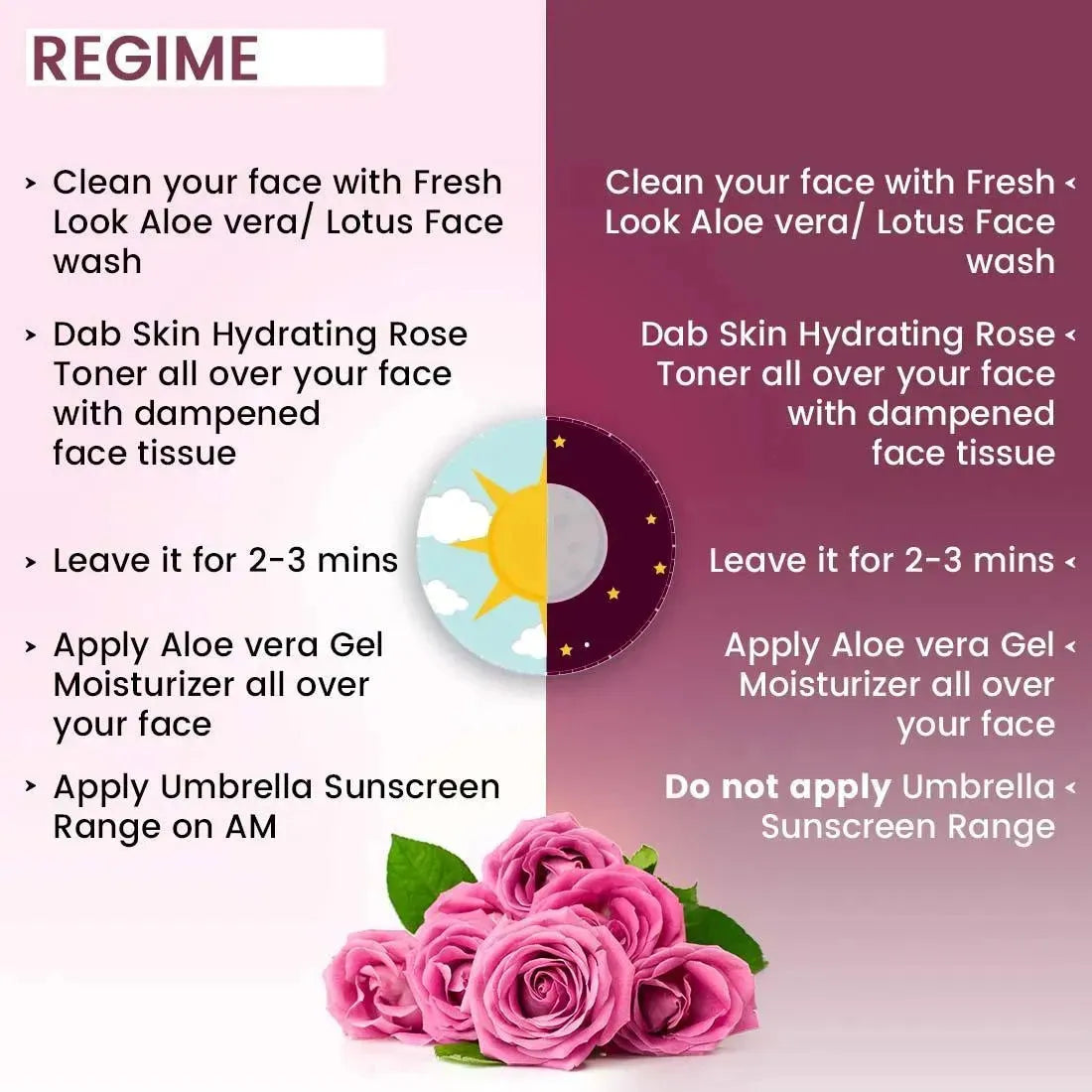 Clean your face with Aloe vera Or Lotus Fresh Look Face wash according to your Skin. Dab Skin Hydrating Rose Toner on your face with a dampened face tissue. Leave for 2/3 mins. Apply Aloe vera Gel moisturizer AM & PM. Use Umbrella Sunscreen Range in AM. Do the same in PM instead of the sunscreen application.