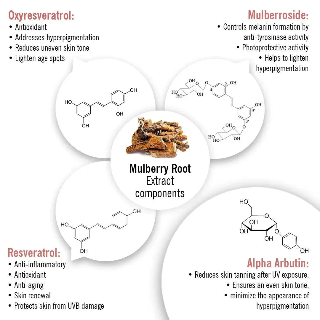 Mulberry Root Extract and Daisy Flower Extract control tyrosinase, reduce hyperpigmentation, and provide moisturization. Alpha Arbutin fades dark spots and blocks excess melanin.