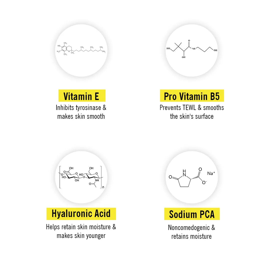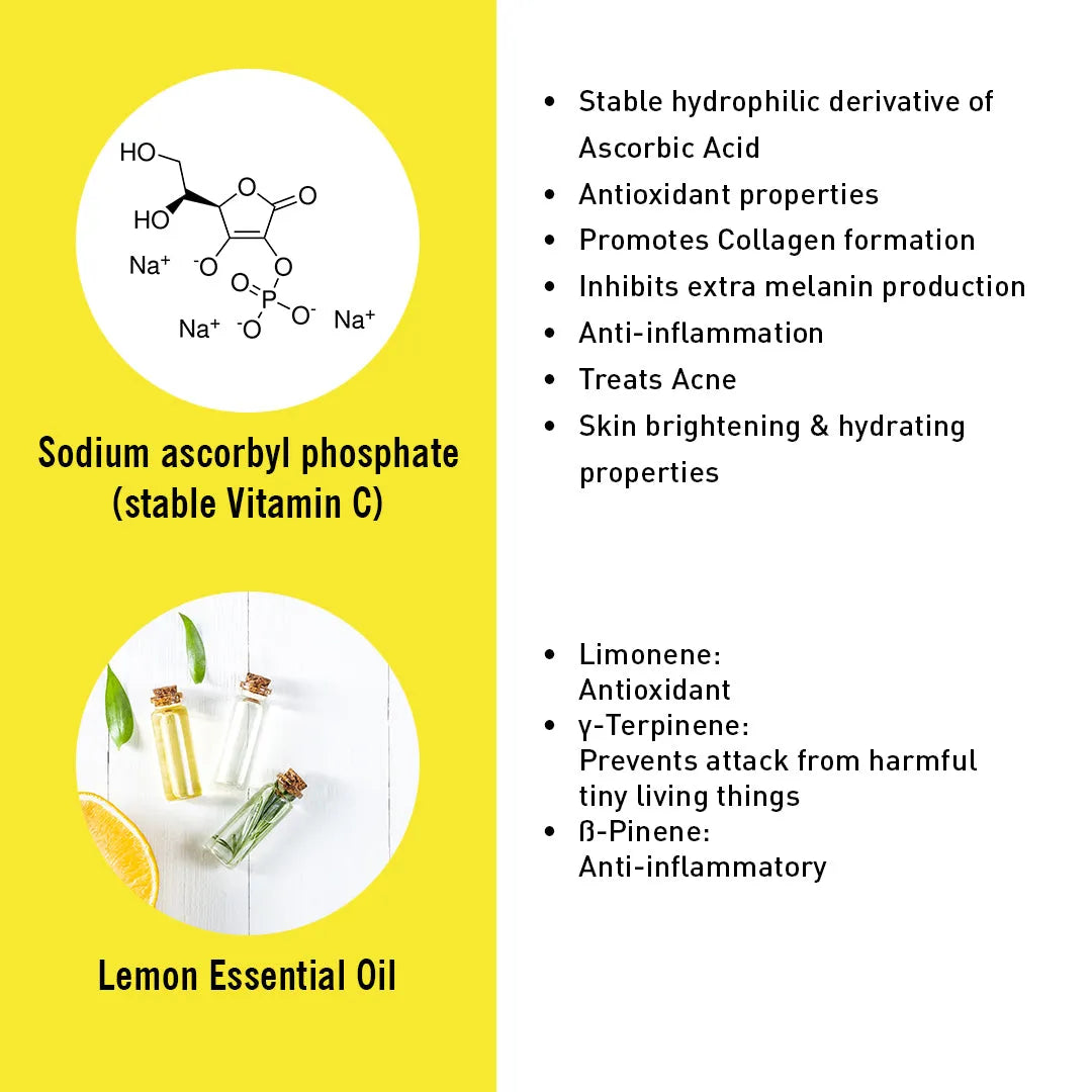 SAP, Lemon Essential Oil & Pro Vitamin B5 rejuvenate the skin, boosting collagen, Improving elasticity, & inhibiting excess melanin production for a tightening, even, glowing skin tone.